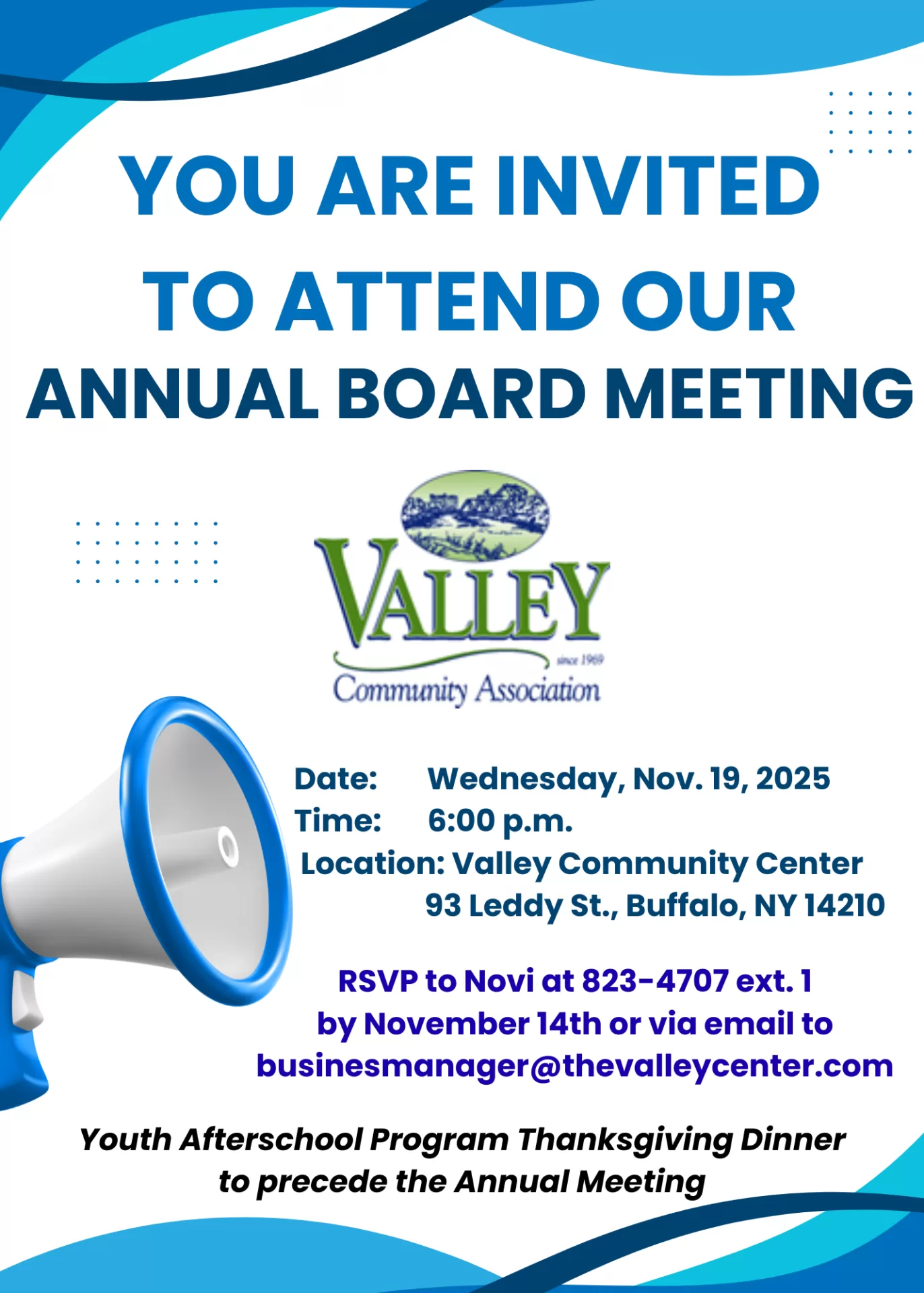November 19 @ 6:00 pm - 7:30 pm Annual Community Board Meeting 11/19/25 The Valley Community Center 93 Leddy Street, Buffalo, NY, United States RSVP requested, but not required.
