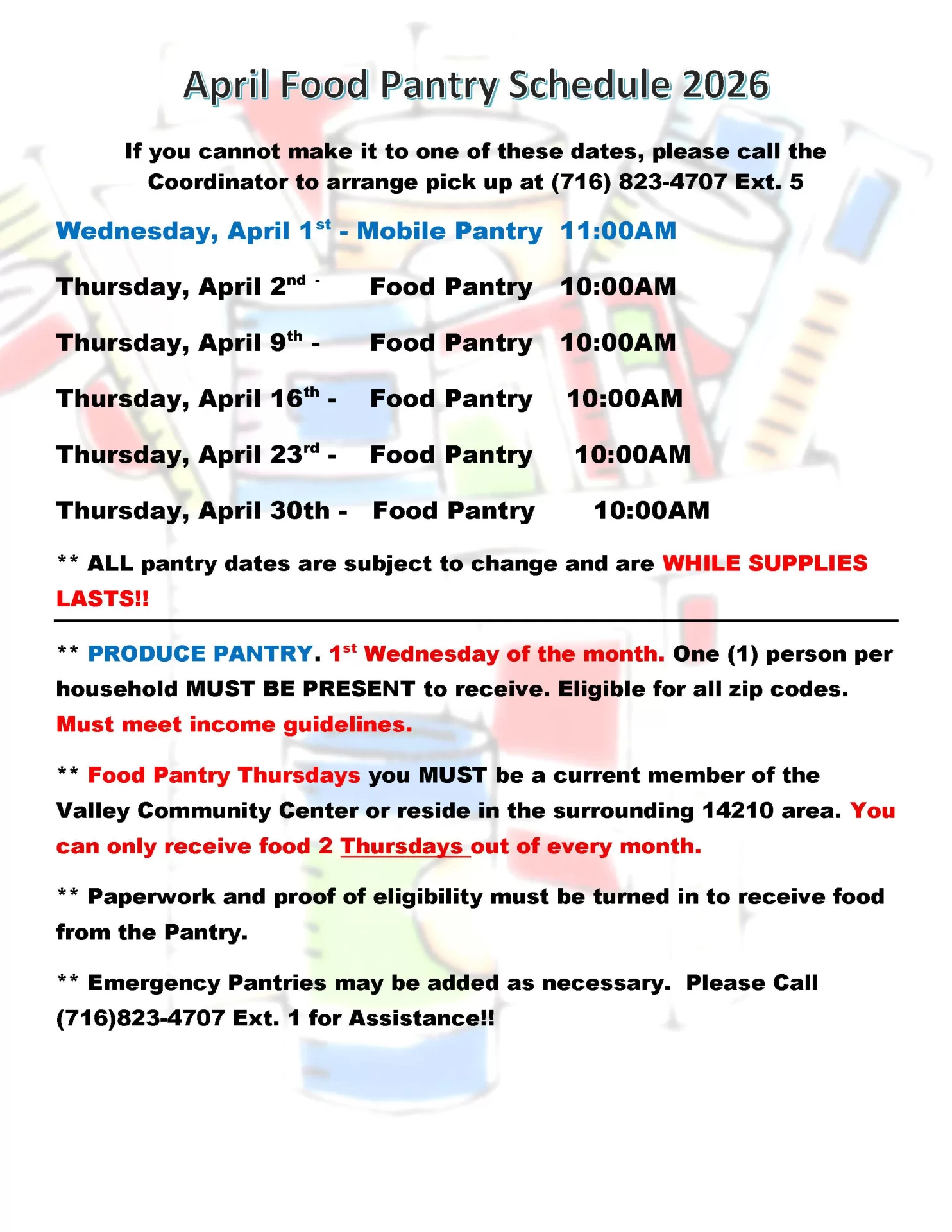 Families not able to make regular distribution days can call the Valley Center to arrange alternate pick up times.